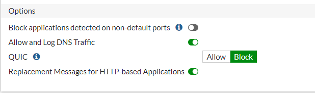 - Under Options, enable Allow and Log DNS Traffic and Replacement Messages for HTTP-based Applications.