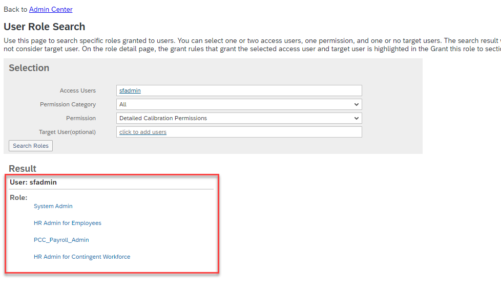 - In SAP Success Factors > Admin Center, search and go to User Role Search.