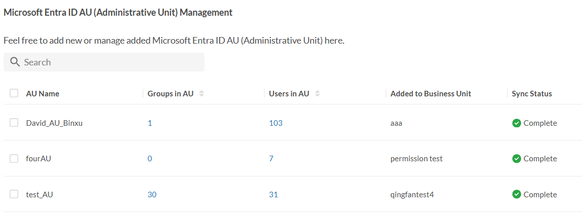 - Go to Company Management, scroll down to Microsoft Entra ID AU (Administrative Unit) Management