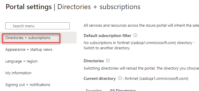 - If you have multiple tenants, click on Settings icon in the top menu, then go to Directories + subscriptions to select the tenant which will register the application with.