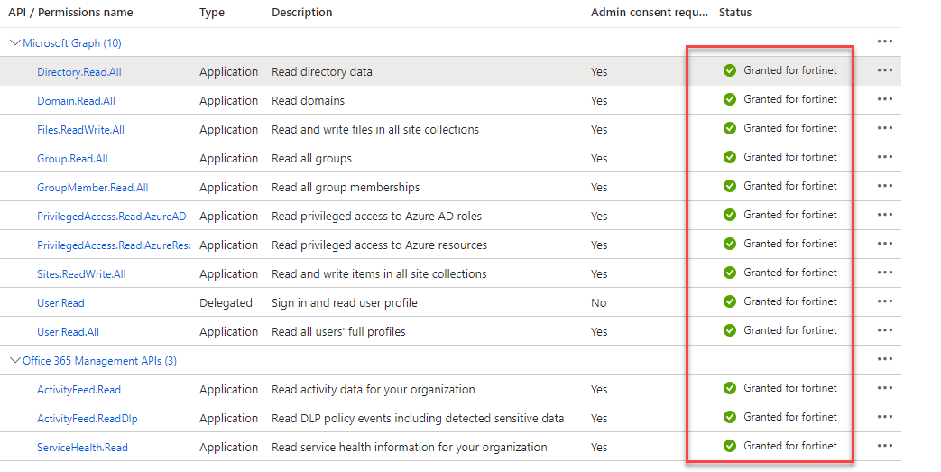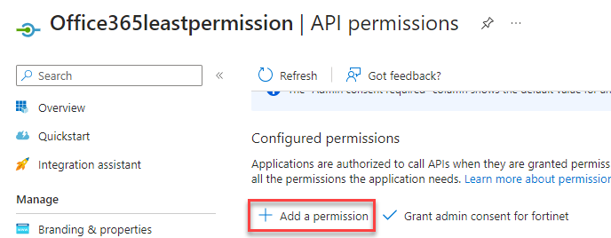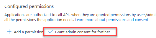 - Click Grant admin consent for fortinet to grant consent for the API permissions for all Office 365 account users under the same tenant.