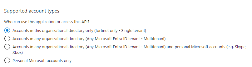 - In Supported account types, select "Accounts in this organizational directory only" to make the application only available to users under the same tenant.