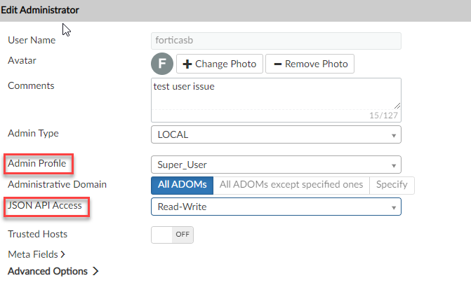 - Go to FortiAnalyzer > System Settings, click on Administrators, select the user to be connected to FortiCASB and press Edit.