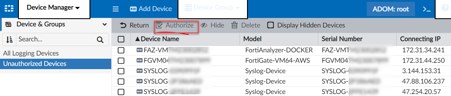 - Go to FortiAnalyzer > Device & Groups.