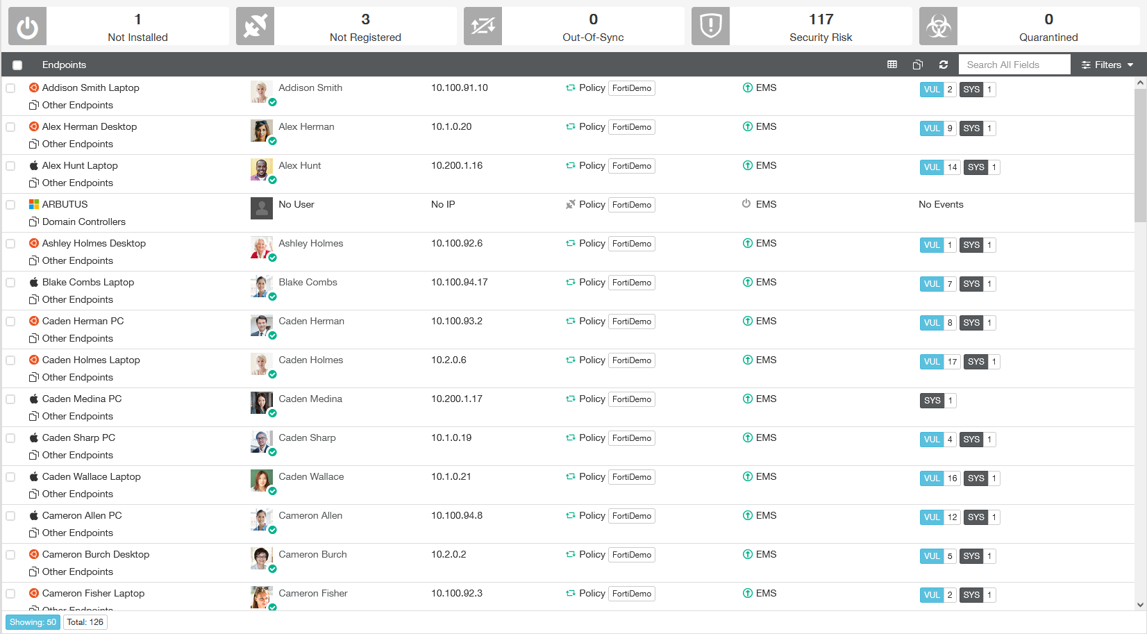 After you add endpoints to FortiClient Cloud, you can view the list of endpoints in a domain or workgroup in the Endpoints pane. You can also view details about each endpoint and use filters to access endpoints with specific qualities.