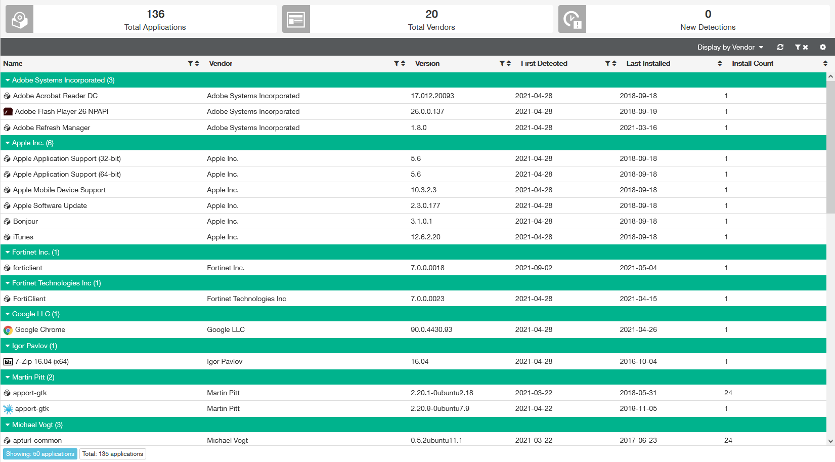 You can centrally view a list of software installed on all endpoints. The list includes details for each application such as vendor and version information. You can view this information by application or vendor on the Applications pane or by host on the Hosts pane. FortiClient sends installed application information to FortiClient Cloud.