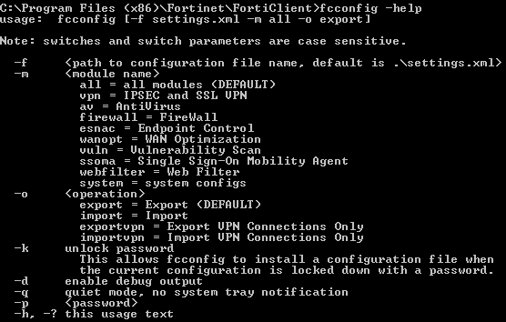 Fortinet provides administrators the ability to import and export configurations via the CLI. The system or admin user can run the FCConfig utility for Windows or the fcconfig utility for macOS locally or remotely to import or export the configuration file. In Windows, the FCConfig utility is located in the C:\Program Files (x86)\Fortinet\FortiClient> directory. In macOS, the fccconfig utility is located in the /Library/Application Support/Fortinet/FortiClient/bin directory.