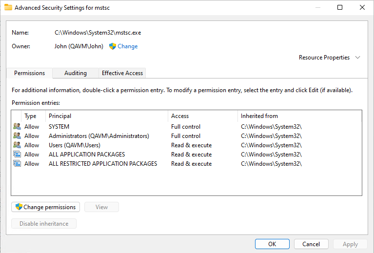 - On the Windows endpoint, go to C:\Windows\System32 and replace the mstsc.exe signed by the public CA with the mstsc.exe file signed by the private CA (myCA.pem). To replace the file, change the permissions on the mstsc.exe file signed by public CA by going to Properties > Security > Advanced, clicking Change beside Owner, and entering the user account that is currently logged in, and clicking OK. Click Apply and OK to save the permission. Then replace the file with the mstsc.exe signed by private CA.