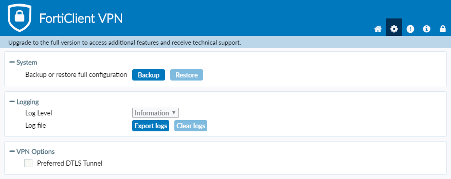 For FortiGate administrators, a free version of FortiClient VPN is available which supports basic IPsec and SSL VPN and does not require registration with EMS. This version does not include central management, technical support, or some advanced features. The free VPN-only client does support SAML.