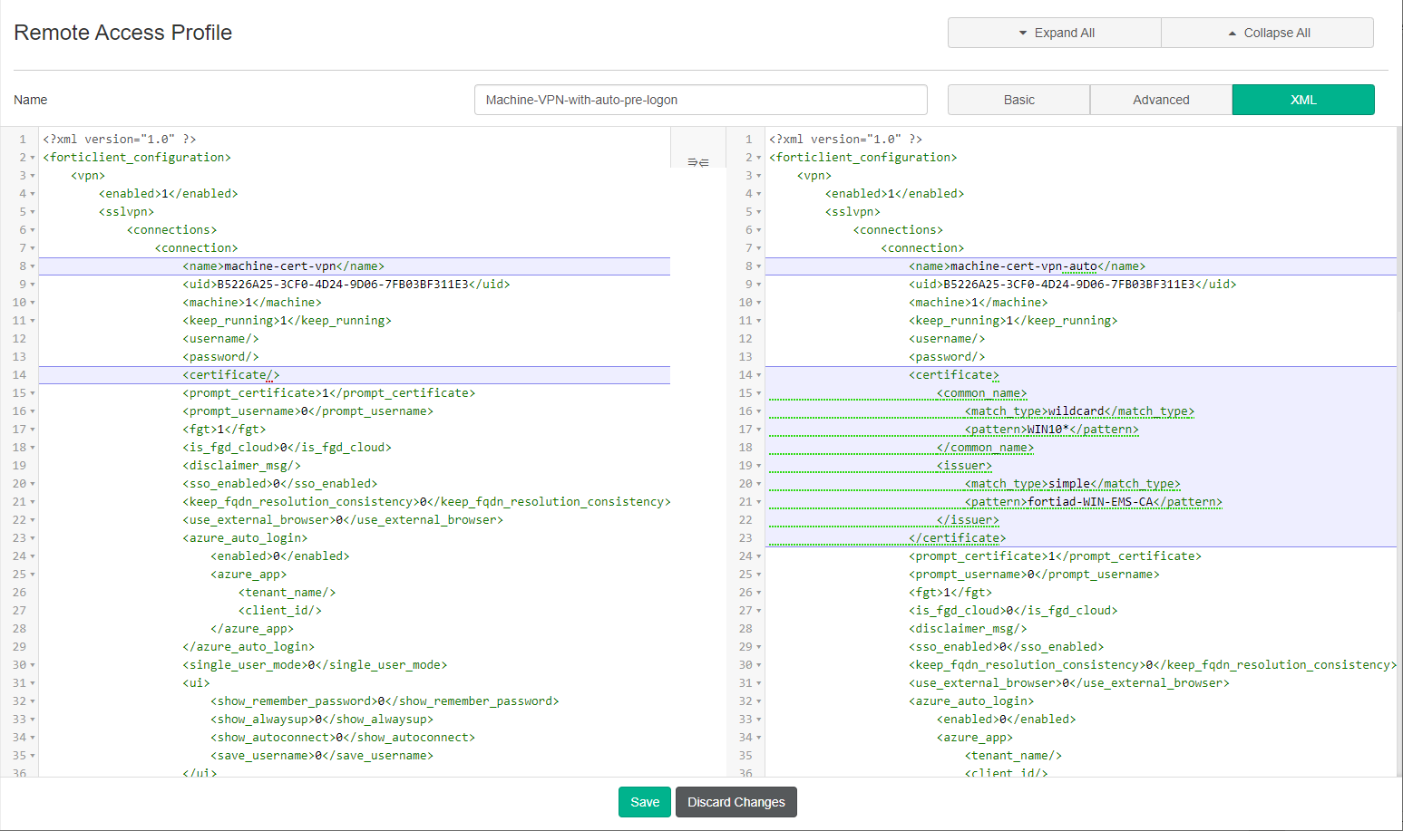 <certificate/>element, and make the following modifications:<certificate> <common_name> <match_type>wildcard</match_type> <pattern>WIN10*</pattern> </common_name> <issuer> <match_type>simple</match_type> <pattern>fortiad-WIN-EMS-CA</pattern> </issuer> </certificate>