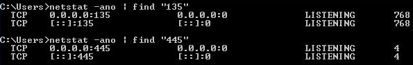 The following shows that Windows is listening to port TCP/135 and TCP/445 on a particular interface: 0.0.0.0 in this case. The PIDs are 768 and 4.