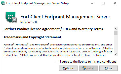 - (Optional) Click Options to specify a custom directory for the FortiClient EMS installation.