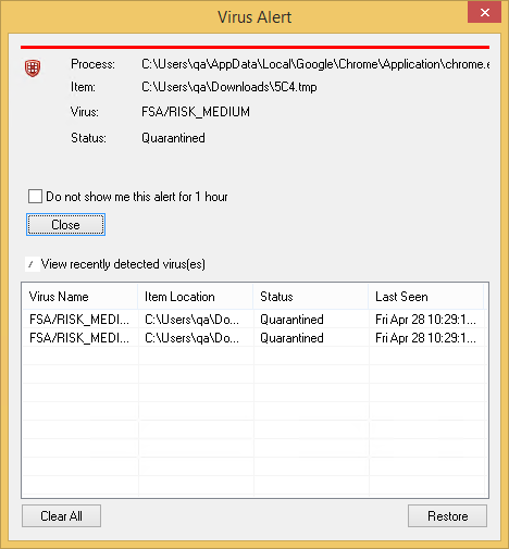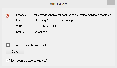 You can use the Virus Alert window to view information about the recently scanned files by clicking the View recently detected virus(es) option.