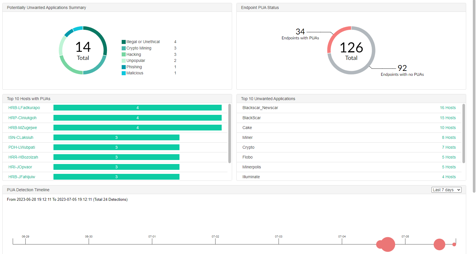 Go to Dashboard > Vulnerability Scan. Here you can view a variety of charts and widgets containing a summary of potentially unwanted application (PUA) information from endpoints.