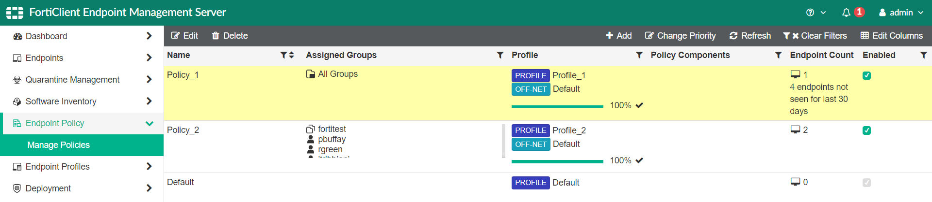 - If a policy is assigned to the FortiClient user, EMS assigns that policy to the endpoint.