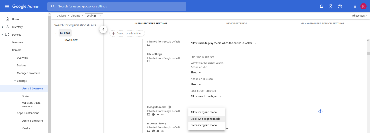 - In User & Browser Settings, under Security, set Incognito mode to Disallow incognito mode.