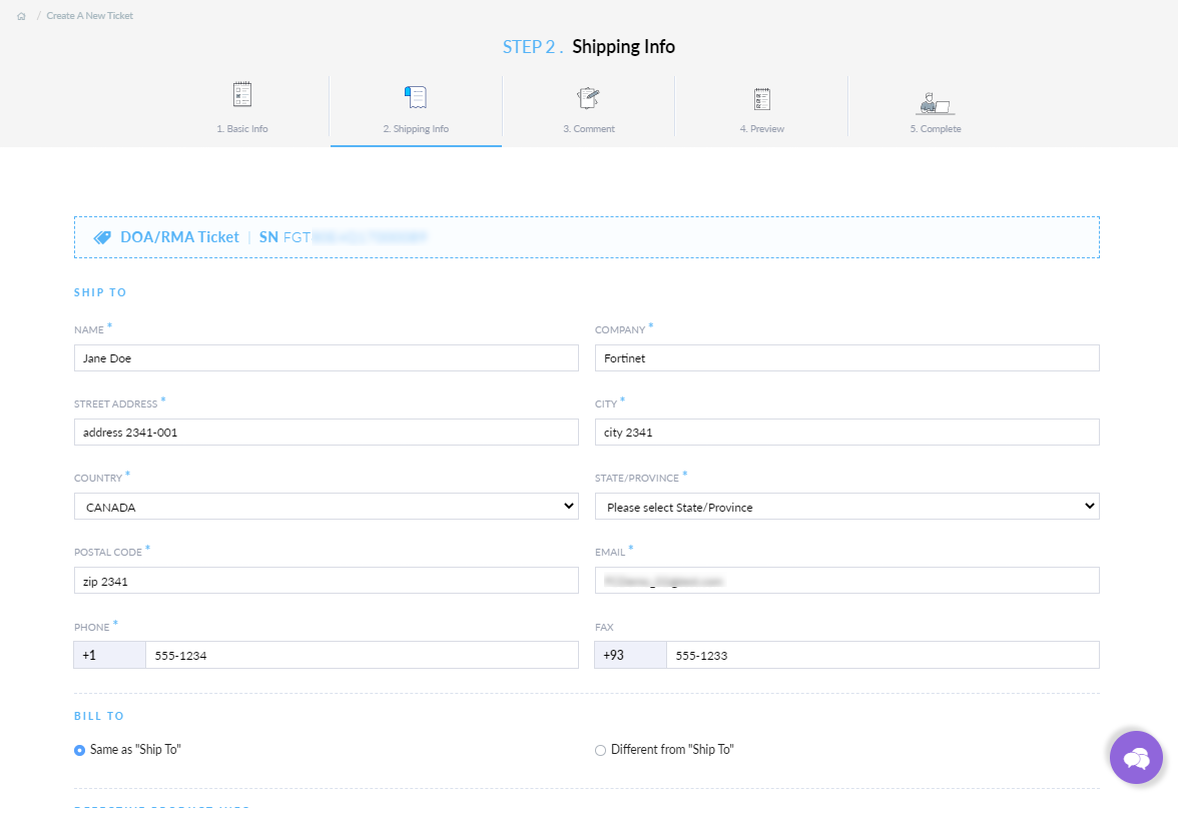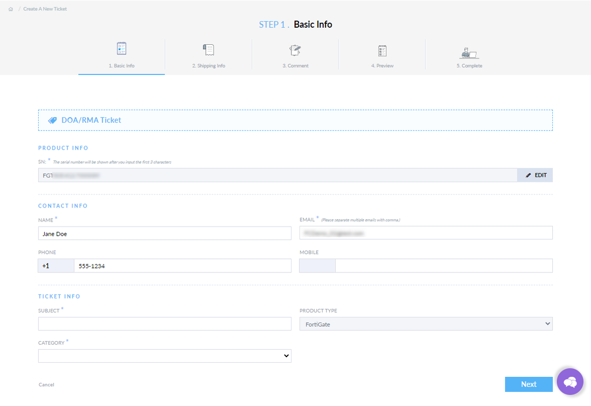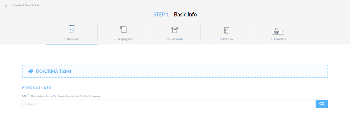 Select DOA/RMA Ticket and click Next. The Basic Info page opens.