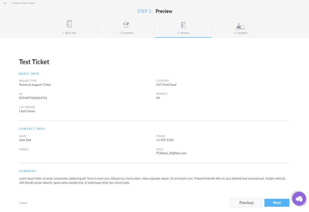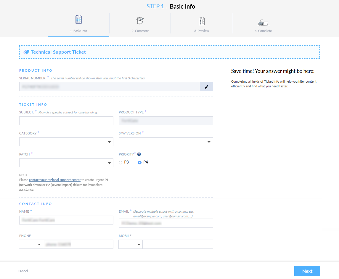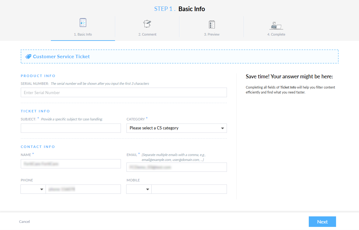 Enter the required information in the Product Info, Contact Info, and Ticket Info sections.