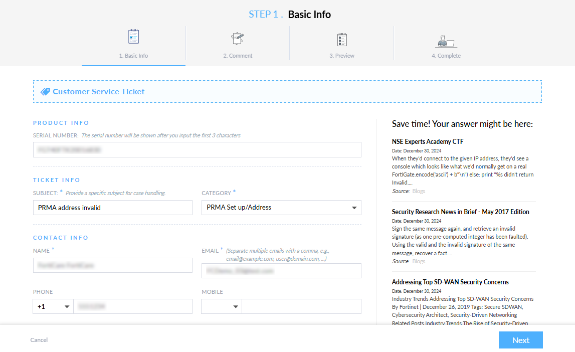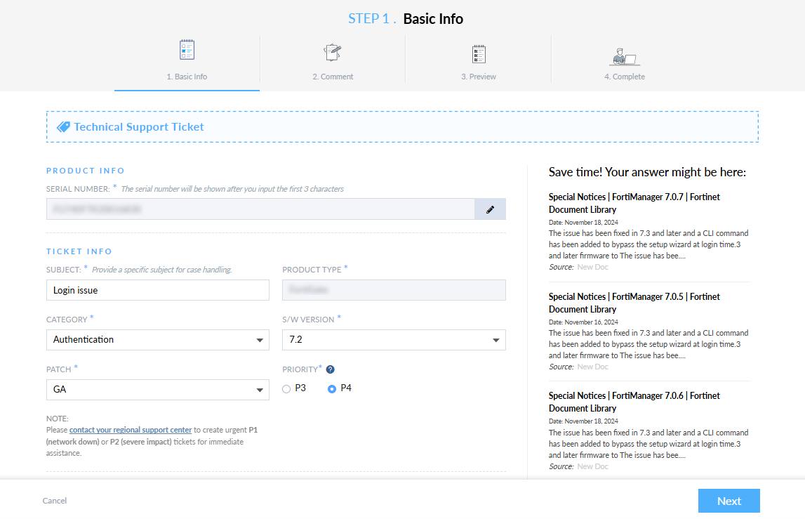 Once the appropriate fields have been entered, FortiCare will display suggested community Knowledge Base articles, Fortinet documents, and FortiGuard resources that may help you solve the issue. Select an article to review the information or provide more detail in the Subject field for more filtered articles.