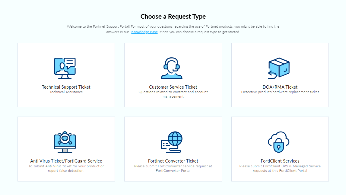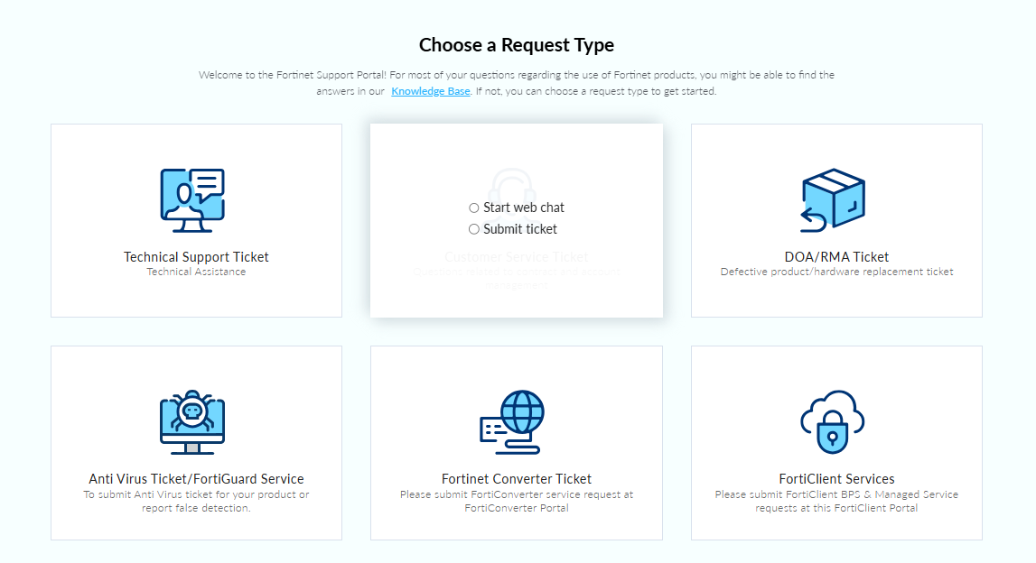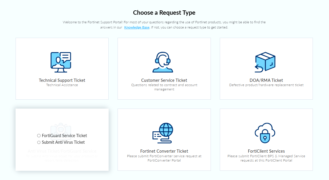 Select FortiGuard Service Ticket to be redirected to the FortiGuard contact page.