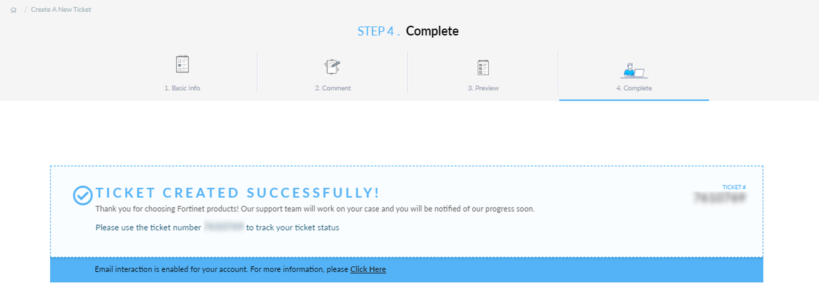 All DOA/RMA tickets will appear in the Tickets page list as an RMA ticket at first. After being review by Fortinet Inc. Customer Service, if it determined to be a DOA ticket, the Request Type will change to DOA after processing. |