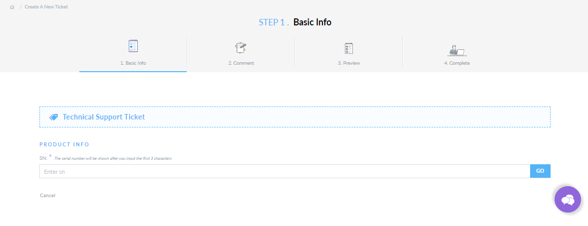 Enter the Product Info and click Go. If the serial number is accepted, Contact Info and Ticket Info fields are displayed.