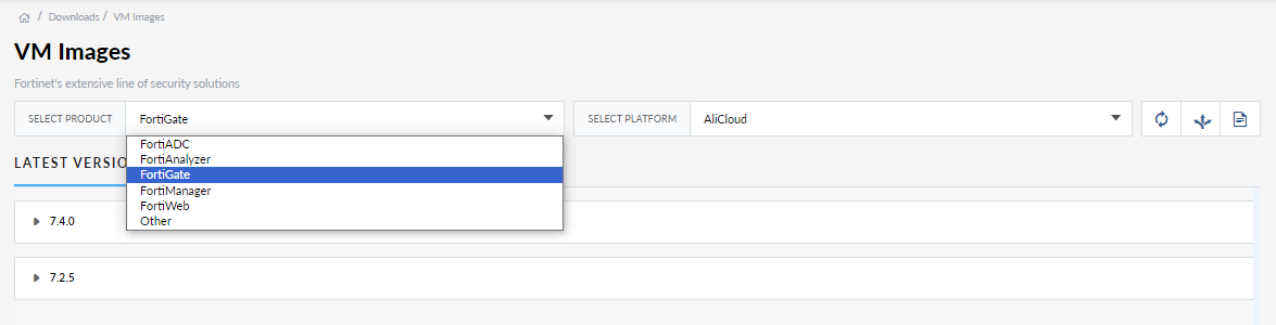 You can refresh, upgrade the path, and access release notes of product VM images from the Downloads > VM Images page. You can select the product, platform, and versions.