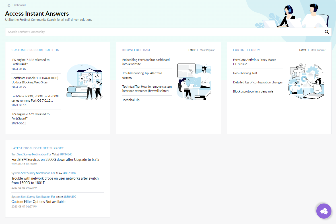 | Latest from Fortinet Support | Displays high-level information on actions performed on your tickets by FortiCare support employees. |