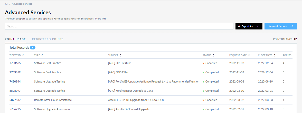 Service Points are exchanged to perform a service request. Each service request is assigned a set number of Service Points. After a request is created, a member of Fortinet's Support team will contact you to review the scope of the request and the number of points required to complete the request. The number of points required may be adjusted depending on the scope of the request. After the scope and points required are agreed upon by you and the Support team, the points will be reserved in your account. Service points are deducted from your points balance at the time a service request is completed.