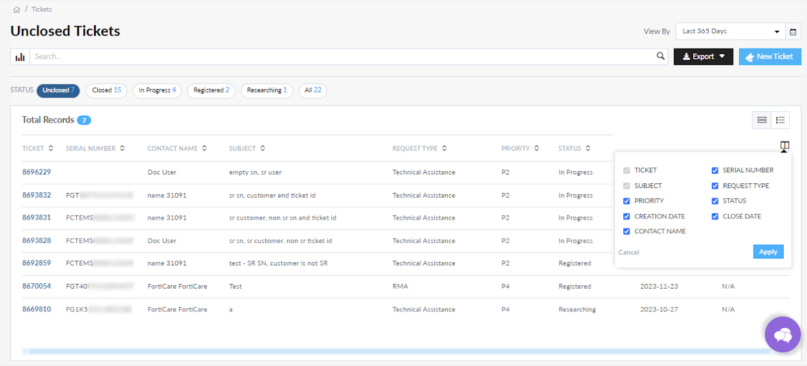 Tickets can be ordered by category, such as Ticket # or Request Type, by selecting the category arrow. More columns can be added to the table from the Column Selector. The columns available depend on the user type accessing FortiCare.