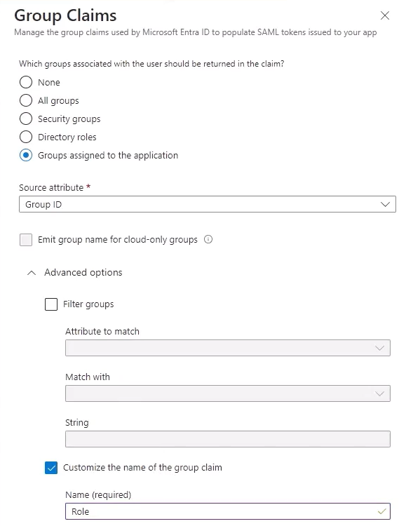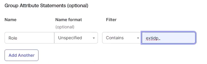In Group Attribute Statements, set the Name to Role and the Filter to Contains > externidp_.
