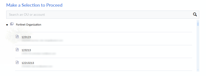 Users can access FortiCloud using IAM user accounts or an OU account when logging in with their IAM user credentials. Once the login credentials have been verified, users can then choose to proceed with an Organizational Unit (OU) account. OU access is dependent on the permission profile assigned to your login credentials. Available OUs and member accounts will turn blue when hovered over and display the Select button.