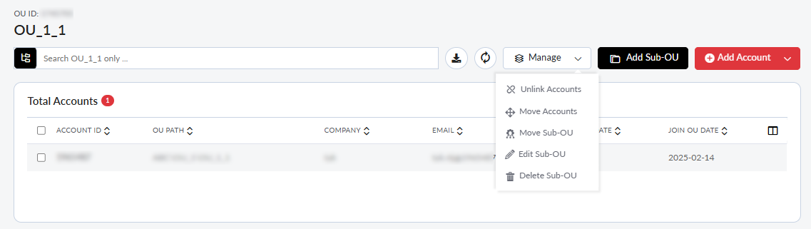 - Select a Member Account in the list and click Manage > Move Accounts.