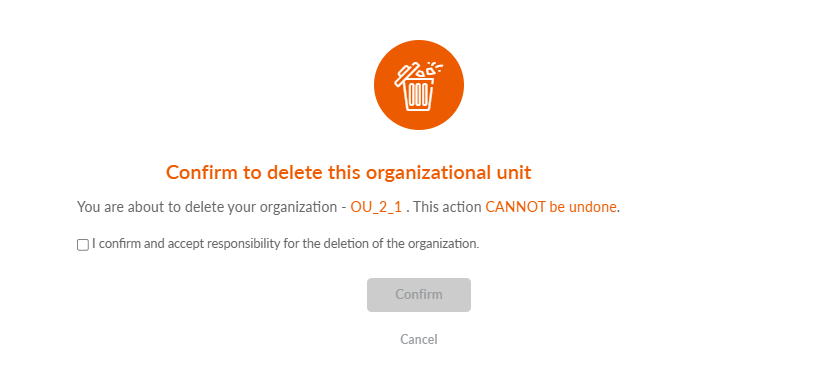 Click Manage > Delete OU. The Confirm to delete this organizational unit dialog opens.