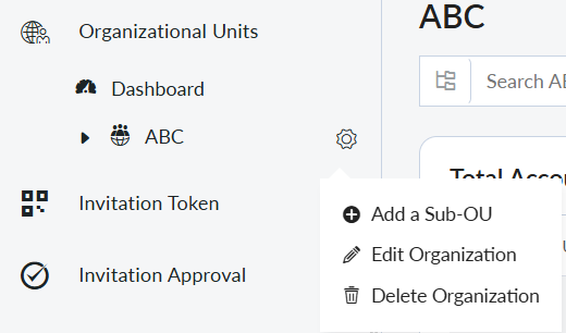 Hover over the organization name and click the gear icon. A dropdown list is displayed.