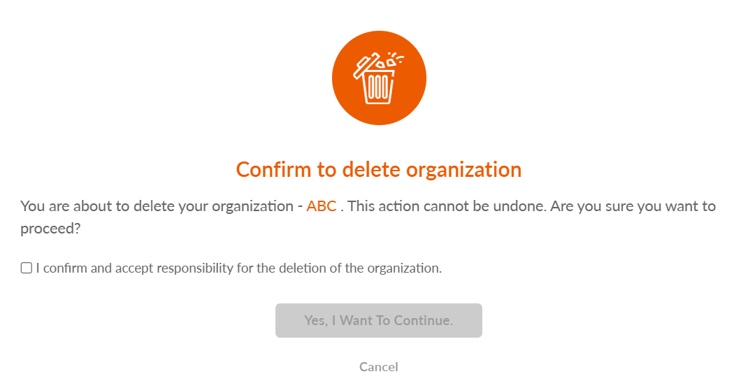 Select the checkbox to confirm you understand that the organization will be deleted.
