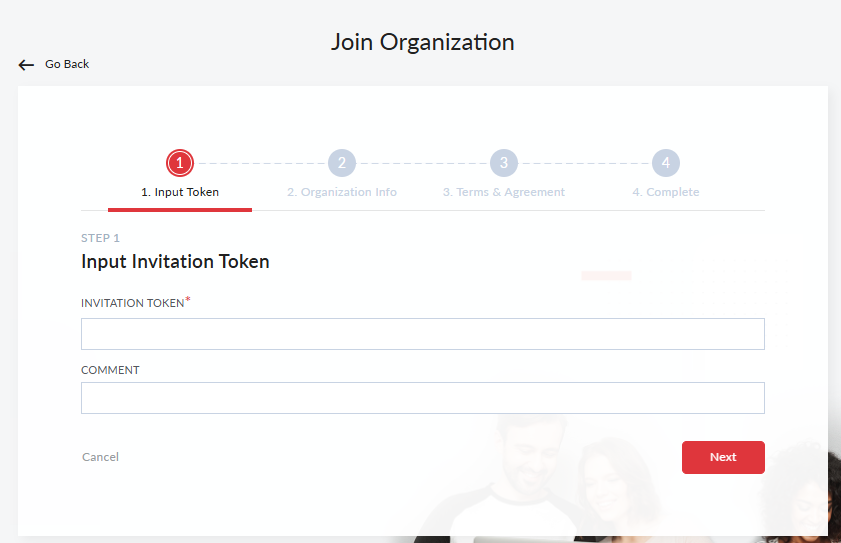 - In the Invitation Token field, enter the token and click Next. The Organization Info Preview page opens.