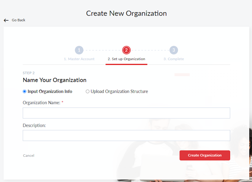 Input Organization Info Select this option to create your organization with the GUI. Upload Organization Structure Select this option to create the organization and Organizational Units with an Excel sheet. See To create an organization with the Bulk Import template. Organization Name Enter a name for the organization. Description