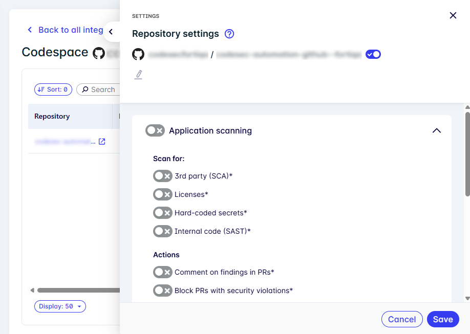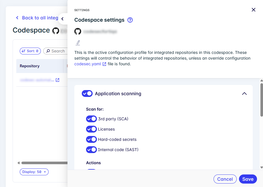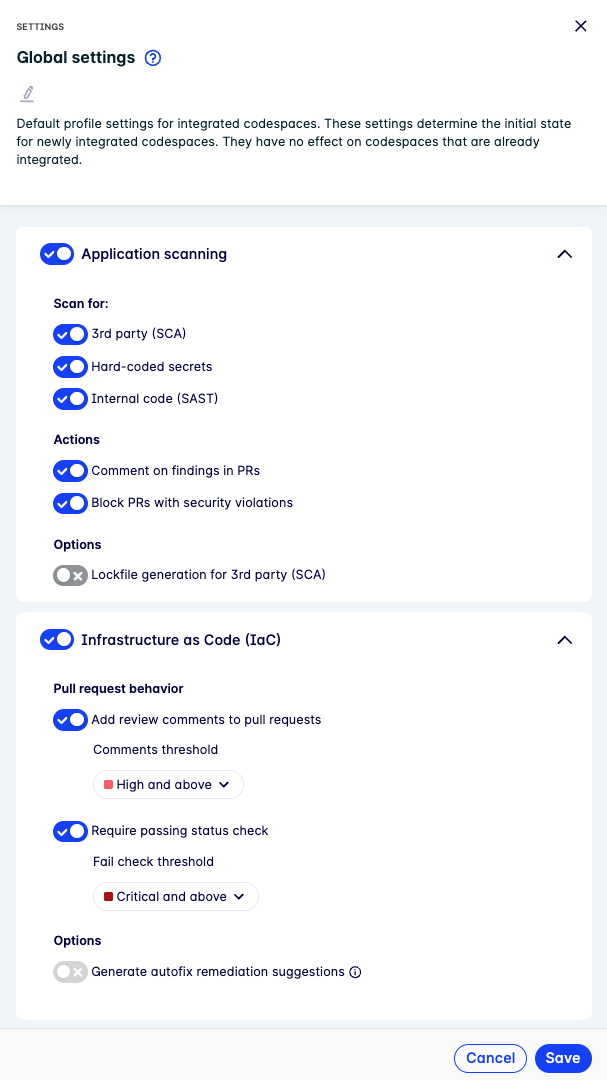 Click Save. Updates apply to pipeline scans and pull request behavior immediately. New codespaces integrated after saving will inherit these settings.