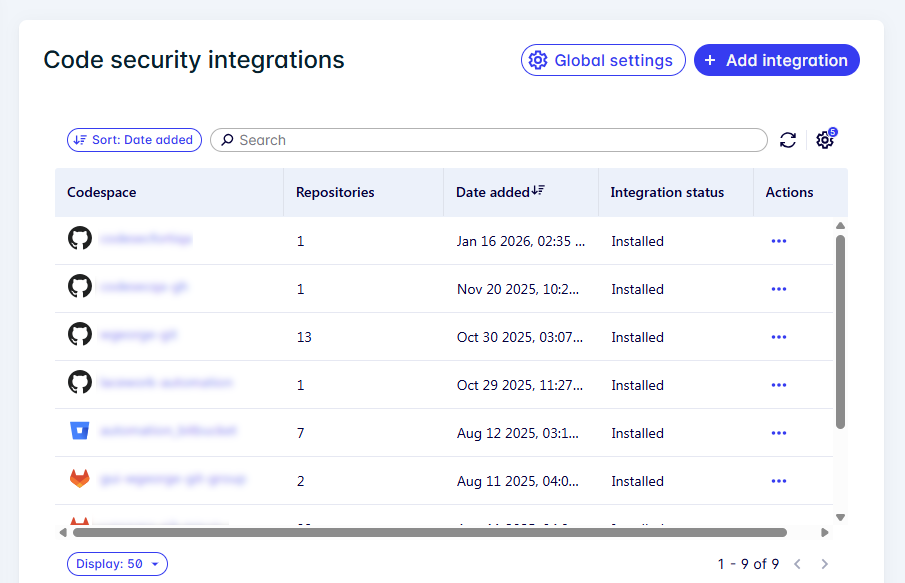 Newly integrated codespaces: When you integrate a new codespace (GitHub organization, GitLab group, or Bitbucket workspace), it inherits the current global settings as its starting configuration.