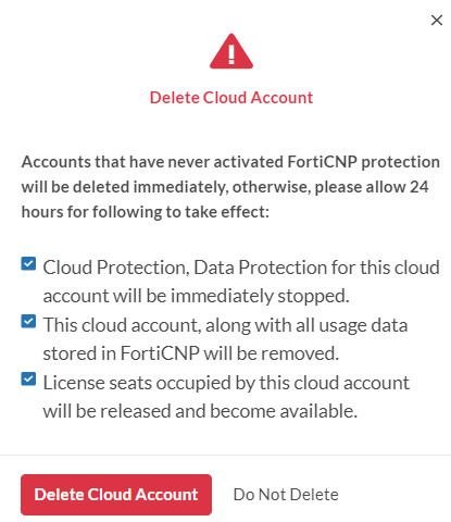When a cloud account is no longer needed to be monitored or if it needs to be deleted to free up Cloud Protection License seats. The cloud account can be removed through FortiCNP Administrator. After the cloud account is removed, the AWS CloudFormation stacks (FortiCNP stack and Security Hub Integration stack) that were created also need to be removed (AWS Cloud accounts only).