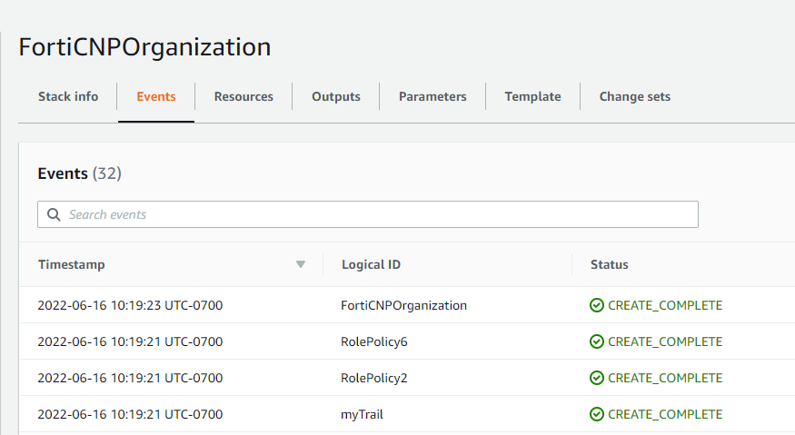 - Refresh the stack creation process of FortiCNPOrganization until the status becomes "CREATE_COMPLETE".