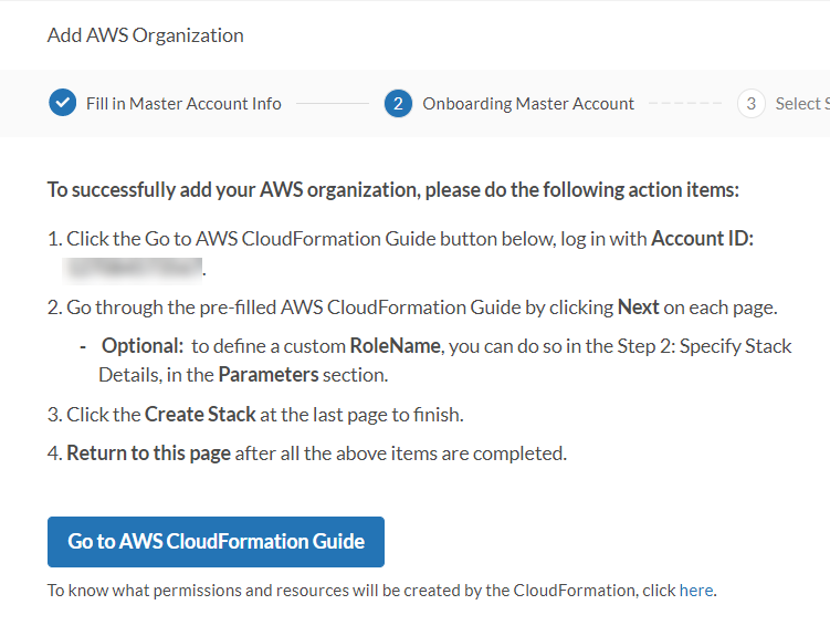 - Click Go to AWS CloudFormation Guide to be re-directed to AWS CloudFormation guide to create stack and cloutrail.
