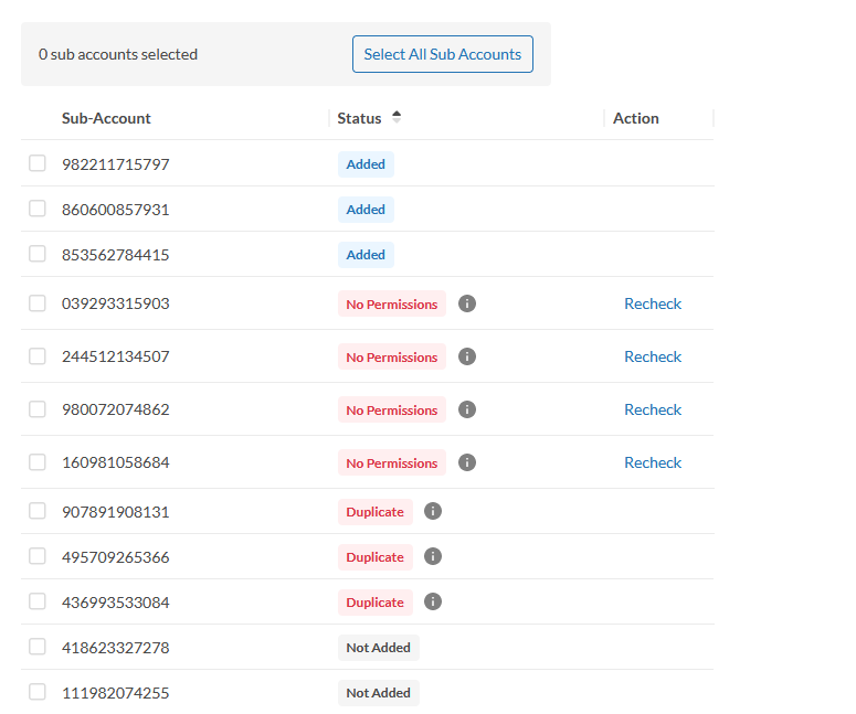 - Select the sub-accounts to be added to the AWS Organization, and click Add AWS Organization. See Add AWS Organization Sub Account Status for more details.