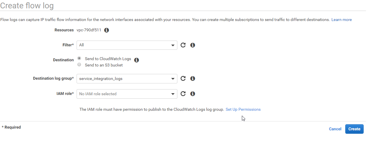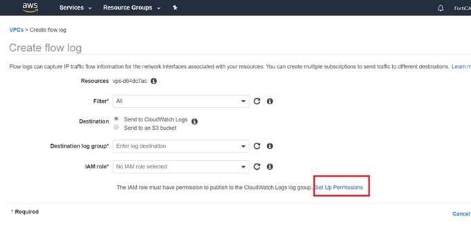 If flowlogsRole is not in the selection, this means that you are setting up VPC flow log for the first time. Click Set Up Permissions to set up a new Role.