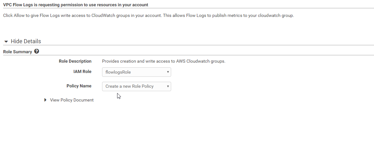 - In the new pop-up screen, next to IAM Role, make sure flowlogsRole is selected, for Policy Name, make sure Create a new Role Policy is selected.