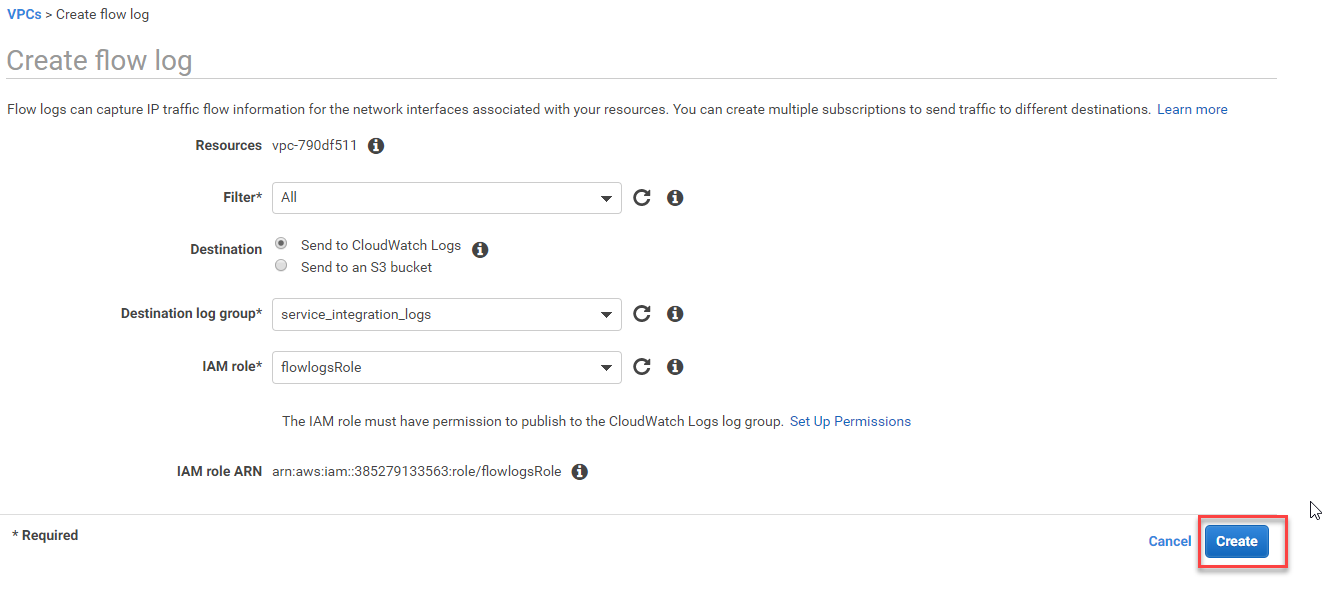 - Now go back to "Create flow log" page, select flowlogsRole under IAM role, then click Create to complete the setup.