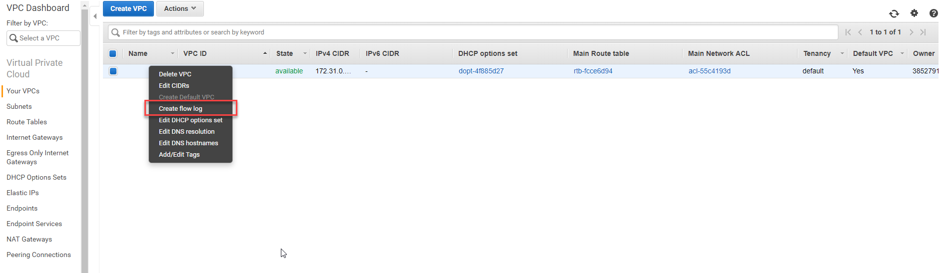 - In VPC Dashboard, click Your VPCs.