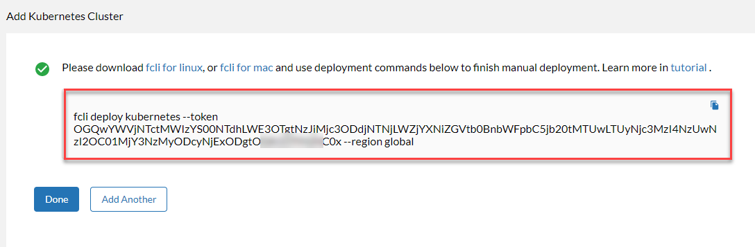 fcli config <Token>Note: The token provided from Add Kubernetes Cluster page. - When prompt for region, enter "