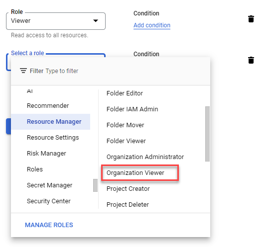 - Then click + ADD ANOTHER ROLE, select Resource Manager > Organization Administrator or Organization Viewer.